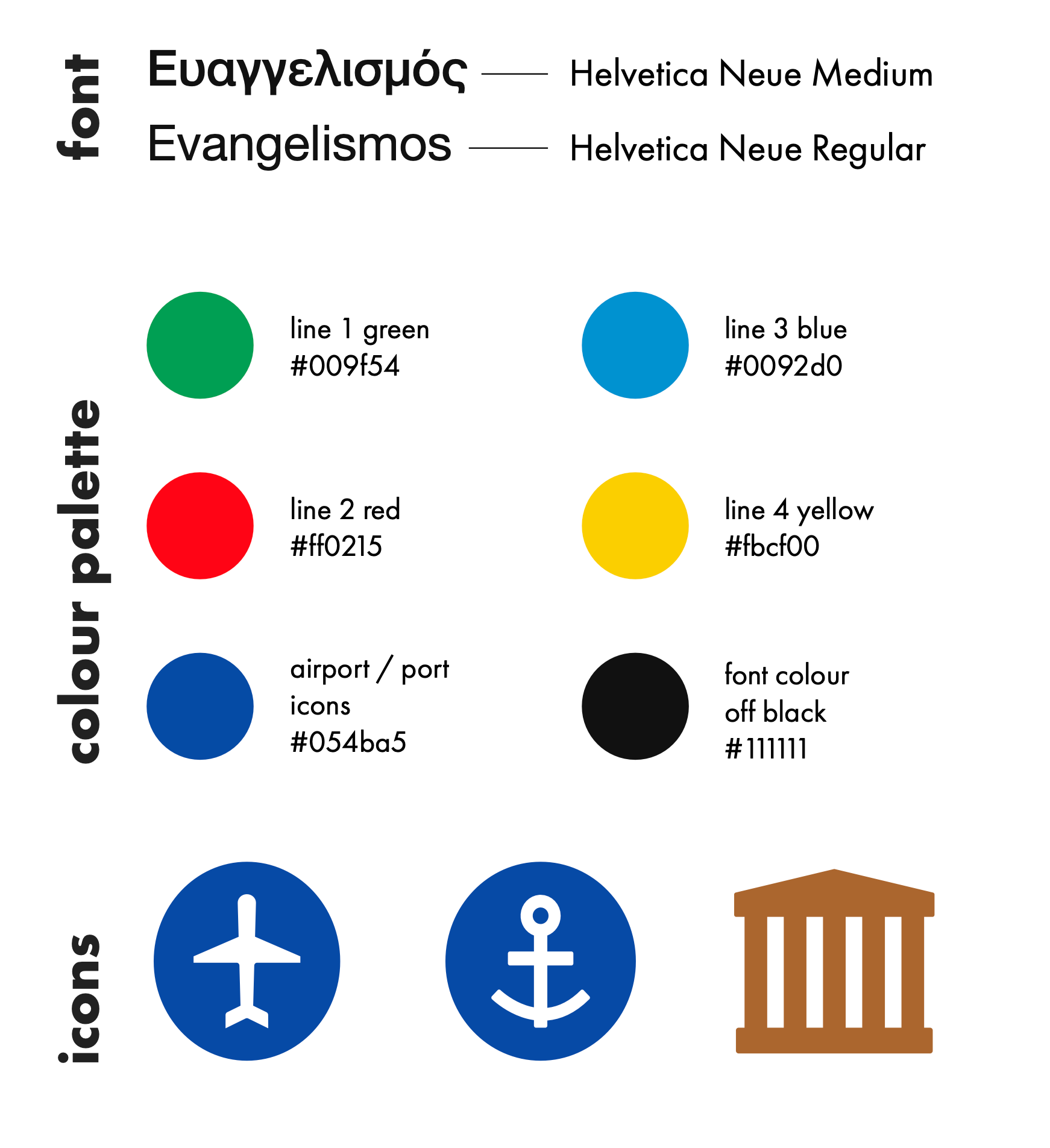 To address the challenges of using both Greek and Latin alphabets, Helvetica Neue was selected as the typeface for the redesign for three main reasons. First, it offers excellent legibility in both print and digital formats, across Greek and Latin characters. Second, it scales successfully, maintaining clarity at sizes ranging from small captions to large display text. Third, Helvetica is already used in Athenian metro signage, allowing for cost-effective implementation while ensuring visual coherence across the system.
