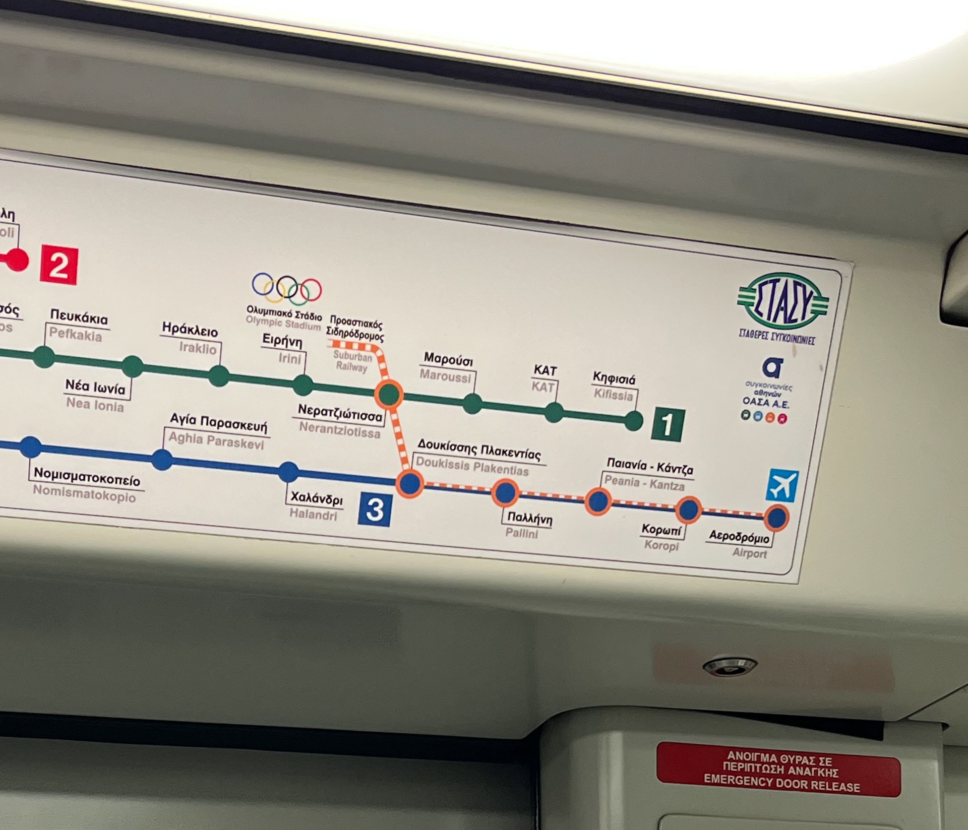 Secondly, the geographical map of Athens Transport (image 2) found on the platforms is informative as a geographical reference, but not intuitive for quick navigation. Some stations even appear only in the legend due to space limitations, as the design prioritizes geographic accuracy over the passenger experience.
